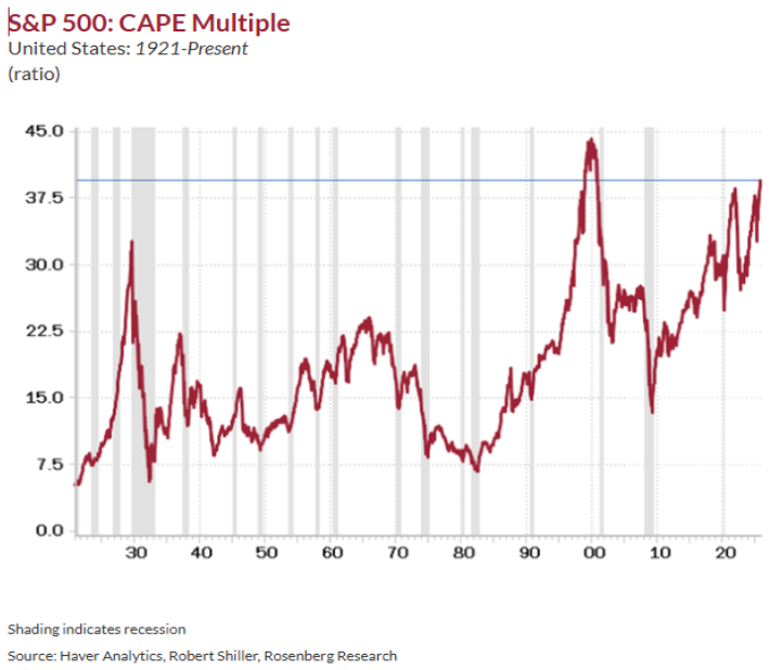 Regarding stock market valuations, we keep hearing that they are becoming “stretched, but not yet at levels consistent with historical bubbles.” We disagree. Valuations by almost all measures we look at are at or near record levels. Start with the most basic long-term reading on earnings, the CAPE (Cyclically Adjust Price Earnings) multiple, also known as the ‘Buffet Indicator.’ The CAPE multiple now exceeds every prior bubble peak in the past century outside of the unprecedented tech mania in the late 1990s and early 2000s. This compares to the 1929 bubble peak of 33x, the Nifty Fifty peak in the late 1960s of 24x, and the 1987 pre-crash peak of 18x. The chart below doesn’t lie. The average bubble peak in this valuation metric is 26x. It is now pressing against 40x. Both the IMF and the Bank of England (BOE) just issued warnings that the AI bubble risks an “abrupt” market correction and the IMF managing director stated that all the bullish sentiment about “the productivity enhancing potential of AI” could “turn abruptly.” The BOE separately concluded that “the risk of a sharp market correction has increased” and valuations are now comparable with the peak of the dotcom bubble.” The only country in the world with a CAPE multiple pressing against a 40x ‘nosebleed’ level is the United States. That seems out of sync, in our view, with a potentially destabilizing government debt load, with the IMF just issuing a report that the lack of fiscal discipline will mean annual budget deficit-to-GDP ratios of 7%-plus through 2030, at which time the U.S. will surpass both Italy and Greece as having the highest debt ratio in the industrialized world. The S&P 500 price-to-sales multiple has expanded to 3.5x from around 3.0x a year ago and 2.5x two years ago and is nearly double the historical norm, with of course the most extreme measure being in the Tech sector, with over a 10x price-to-sales ratio.