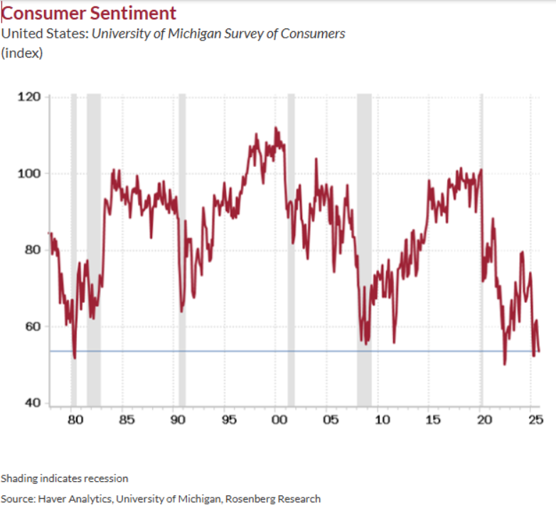 The paradox of economic data, which has been far less robust than the stock market bulls would have us believe. We don’t need government data to know what’s happening with the U.S. economy. The Fed’s Beige Book said it all: the share of the national economy that is still expanding has collapsed in the past six weeks to 18% from 43%, a marked difference from the 100% share of the economy that was at least expanding slightly or modestly at the turn of the year. While many claim that a recession is out of the question, real disposable personal income has contracted at a -1.2% annual rate over the April-August period. But real expenditures are up at a +2.7% pace because we have experienced an epic drawdown in the personal savings rate to 4.6% from 5.7%. This is simply a very real reflection of the power of the “equity wealth effect” on spending, all concentrated at the high end of the income echelon, as the lower and middle classes have not participated in this last leg of the consumer spending file. But spending predicated on bloated monthly financial statements as opposed to what the labour market delivers is a “low quality” consumer profile that deserves a low multiple to be attached to it. The University of Michigan headline sentiment reading is in the bottom 1% share of all time, at 53.6, or more than 37% below the long-run mean of 85. That number is worse than the most depressed readings in ten of the past eleven recessions! So why has the economic data remained positive? So, we looked at the equity sentiment index which, at 56.1, is above the historical average and never has this series been so high with the overall consumer confidence metric so low. Investors are spending based on the wealth they feel from stock market gains. This is far less reliable and sustainable than spending based on employment growth, which we believe continues to deteriorate during absence of economic data we are getting due to the government shutdown in the U.S. Only once since the end of the Great Recession have hiring intentions in the Business Roundtable survey been as low as they are today, and that was during the peak of the pandemic in the second quarter of 2020. The share of the U.S. economy in expansion mode these past six weeks, at 18%, is the lowest share since May 2020. The economy, at least qualitatively, is in a mild recession. The stock market doesn’t see it, but the bond market does!