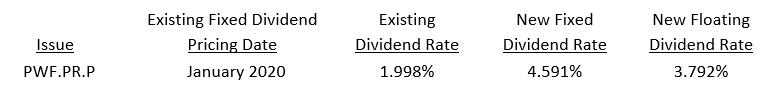 There were no new issues of preferred shares in January. During the month, one series of preferred shares reset its dividend. The dividend rate reset significantly higher because the 5-year Canada bond yield was substantially higher than the pandemic levels of five years ago. Details of the resetting issue were as follows: