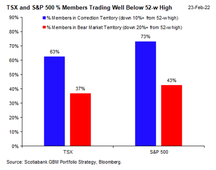 Weak stock markets so far in 2022 had been driven primarily by inflation fears and massive conjecture about the Federal Reserve and future direction of interest rates.  But it took a geopolitical conflict to finally push the S&P500 into official correction territory, dropping more than 10% below its early January peak. But even before the Russia-Ukraine conflict came to the fore, most investors were already feeling the pain from the sell-off in the high growth stocks that had lead the stock market higher for most of 2020 and 2021.  The 2022 decline was entirely explained by a contraction in price-earnings multiples, as 2022 earnings estimates had actually been rising, with 57% of companies and seven of eleven sectors experiencing upward revisions.  But the advance was narrow, with most of the gains so far this year concentrated in the energy stocks as well as some selected cyclicals such as banks and metals.  The chart below shows that 37% of stocks in the Canadian TSX and 43% of stocks in the S&P500 were already in bear markets (down more than 20%) even before the Russian armies moved into the Ukraine.  The anticipation of rising interest rates to control the highest inflation rates in over 30 years had been shrinking stock valuations for the last few months, pushing the ‘tech heavy’ Nasdaq Index into an official bear market.