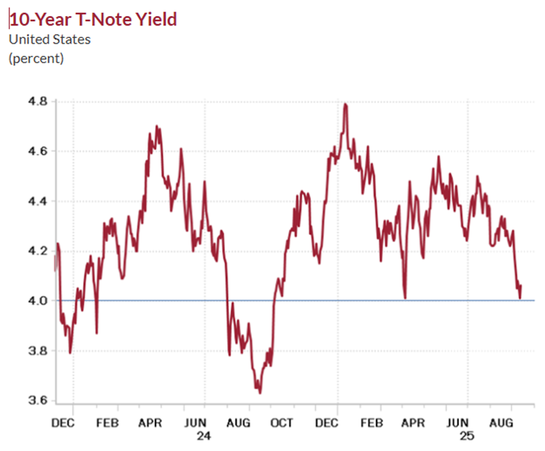 We have adjusted our bond market strategy and lightened up on long bond positions on recent strength, despite our view of slowing economic conditions. While we expect short term rates to go lower, we think that ‘sticky’ inflation and worries about too much easing will keep long bond yields near current levels and maybe even a bit higher. The risk is that the combination of lower interest rates and ongoing fiscal stimulus keep inflation at elevated levels. We reduced long-term bond holdings on last week’s rally and look to move some of that into mid-term corporate bonds or preferred shares. The potential volatility in the structure of the U.S. Federal Reserve and the greater influence over interest rate decisions from the White House have increased the risk that we see long-term interest rates rise even as short-term rates fall. President Trump is attempting to rid the Federal Reserve of the ‘interest rate hawks’ and replace them with his own choices, all of whom would be more receptive to following the White House wish for much lower interest rates. If this were to occur, we could see the next Fed chief become “Arthur Burns 2.0”, a reference to the disastrous term of the Nixon-appointed Fed chief during the 1970s, who acceded to the White House push for lower rates that resulted in inflation at double-digit levels and short term interest rates rising to the mid-teens as the decade ended and a subsequent ‘double dip’ recession in the early 1980s. Looking at the chart below, we are going to have to see almost recessionary economic conditions to drive 10-year government yields below the key 4.0% threshold.