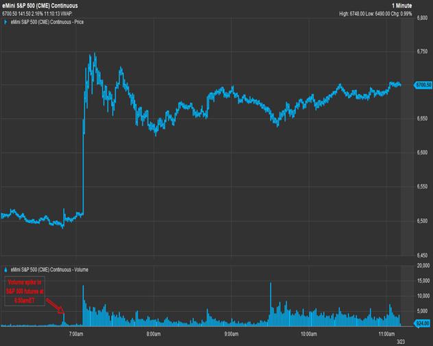 OK, SOMEBODY knew SOMETHING! On the morning of March 23rd with S&P 500 futures setting up for another weak opening, stock and oil futures flashed an unusual burst of activity minutes before a market-moving social media post from President Trump. At around 6:50 a.m. in New York, S&P 500 e-Mini futures trading on the CME recorded a sharp and isolated jump in volume, breaking from an otherwise subdued premarket backdrop. With thin liquidity typical of early trading hours, the sudden burst stood out as one of the largest volume moments of the session up to that point. A similar pattern was observed in oil markets. West Texas Intermediate May futures saw a noticeable pickup in trading activity around the same time. But the oil activity was from a short seller, meaning someone who was expecting oil prices to fall. Roughly 15 minutes later, Trump said on Truth Social that the U.S. and Iran had held talks and that he was halting planned strikes on Iranian power plants and energy infrastructure. That announcement prompted an instant rally in risk assets, with S&P500 futures soaring more than 2.5% before the opening bell. At the same time, West Texas Oil futures dropped nearly 6% following the announcement. The U.S. Securities and Exchange Commission and the CME Group declined to comment!