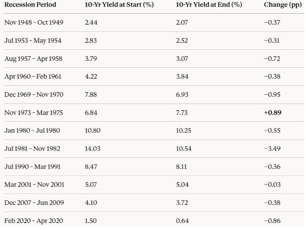 The economic risks from higher oil prices have major historical precedents. All but one of the post-1945 U.S. recessions has been preceded by rising crude oil prices caused by supply disruptions. It has led analysts to implicate oil price shocks as an important “force multiplier” in U.S. slowdowns, even if not the main factor. While recessions have often been precipitated by sharp increases in oil prices, bond prices generally fall during recessions. So far this year, though, oil prices have spiked but bond yields have also moved higher. As shown in the table below, that only happened one other time during every recession since the Second World War. That runs counter to what usually happens in U.S. recessions, during which bond yields decline (despite the adverse impact that recessions have on government tax revenue) and probably help spur recoveries in yield sensitive sectors. The reason it “might be different this time” is that the War could expand the deficit at a time when the US debt load is already high, spurring concerns of eventual monetization and inflation.